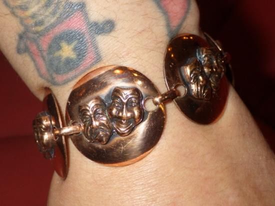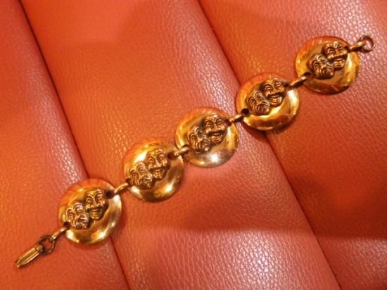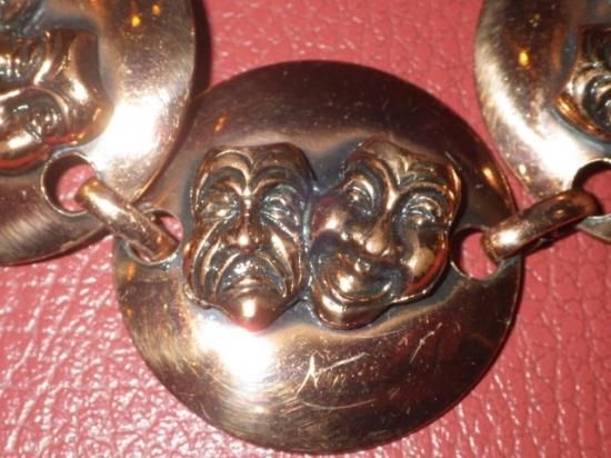 立体的なハッピーフェイスとサッドフェイスが付いたプレートが交互に繋げてあり、太さもあるので存在感がございます、現代のものにはないメタリックなカッパー独特のカラーが魅力的なヴィンテージらしい表情のオススメのブレスレットです♪