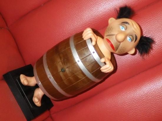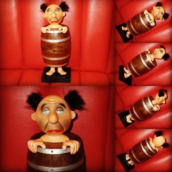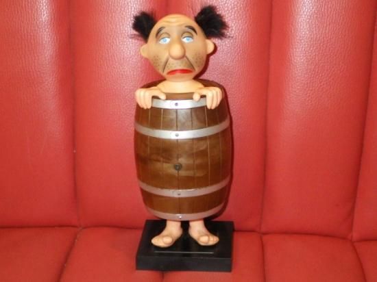 素材は頭部がソフビ、他プラスチック、サイズは高さ21cm、樽部分の横幅8cmくらい、とぼけた面の樽オヤジが雰囲気GOODです♪