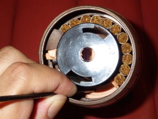 おまけで針金を曲げたセッティング用のチープな棒もおつけしておりますので実用も可能です、使用する場合は樽の蓋部分を回して外し、中の穴に棒を通して右回りに回転させます、上の穴から通した棒を更にそのまま差し込んで下の穴にも刺します、空いたスペースにタバコを入れて蓋を閉めれば設置完了、樽を持ち上げるとタバコが出てくる→そいつを吸うと美味い♪といった流れです♪