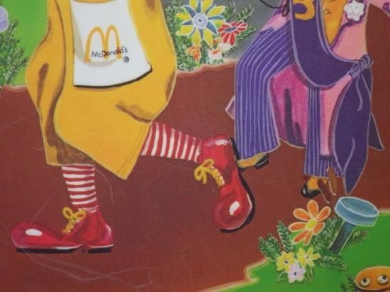 先頭を歩くロナルド、その後ろにマクドナルドランドの市長メイヤーチーズマック、マックシェイクを3つ飲みするグリマス、船長らしく船の指揮をとるようなポーズのキャプテンクローク、ハンバーガーを盗むイタズラ者ハンバーグラー(初期デザインなのでお爺さん)、それを後ろから取り締まるビックマックポリス、最後尾にはマクドナルドランドの研究者であるプロフェッサー、周りにはパレードの様子を観ているフライキッズたち、林檎の木にはアップルパイ、茂みにはハンバーガーにポテトというご機嫌なデザイン♪