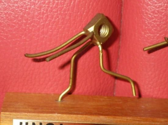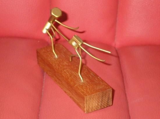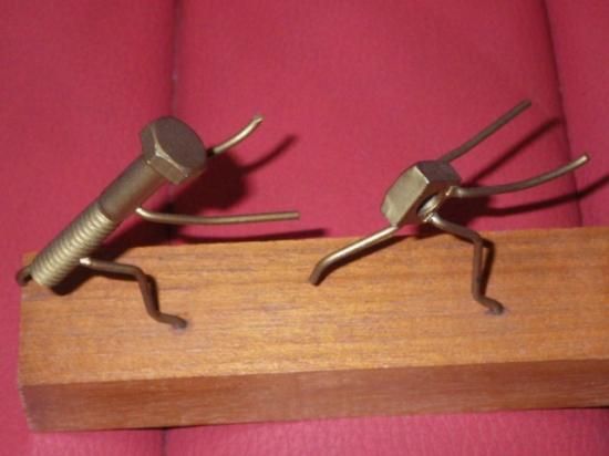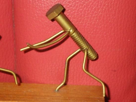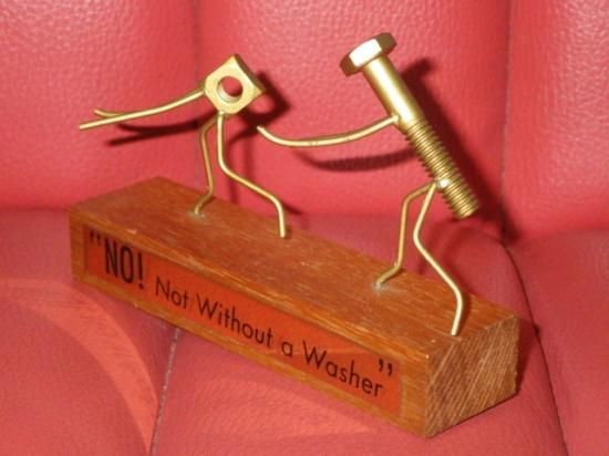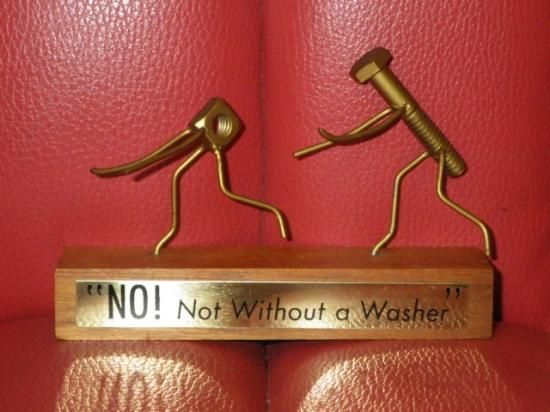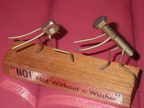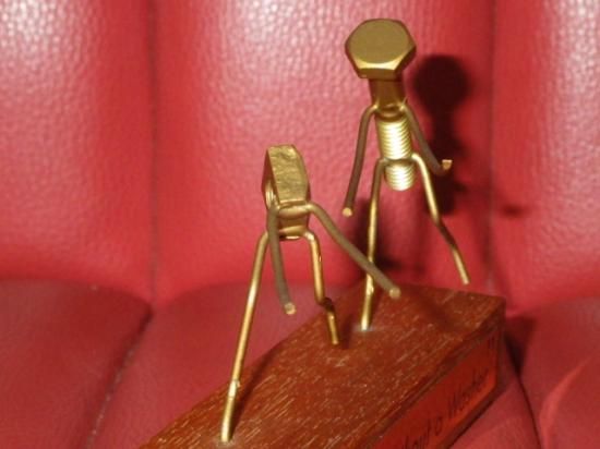 メタルのプレートが貼られた木製の台座の上で、ナット(女性)が『ダメ!ワッシャーなしじゃダメ!』と叫びながらボルト(男性)から逃げているジョークが効いた一品♪