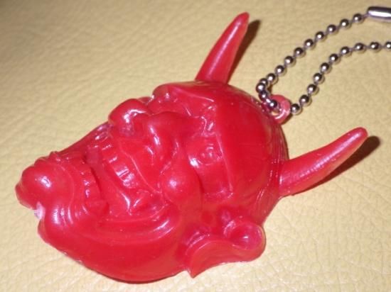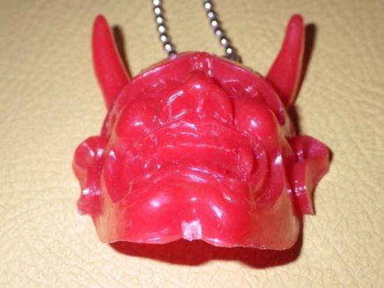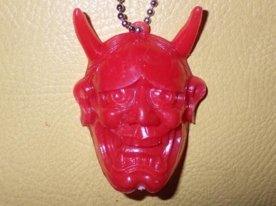 素材は硬いプラスチック、サイズはチェーンを除いた面のサイズで縦:6.0cm×横幅:4.6cmくらい、古い表情の般若がCOOLです♪