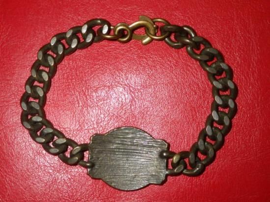 メタル素材、サイズは全長21.5cm、プレート部分の大きさが縦:2.5cm×横幅(フレームの幅):3.0cm、チェーンの幅:0.9cm♪