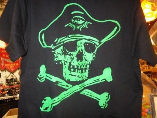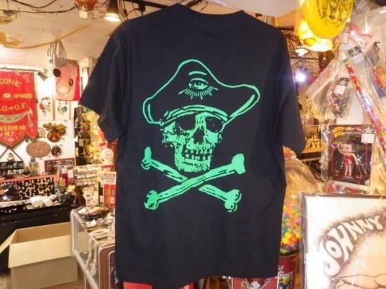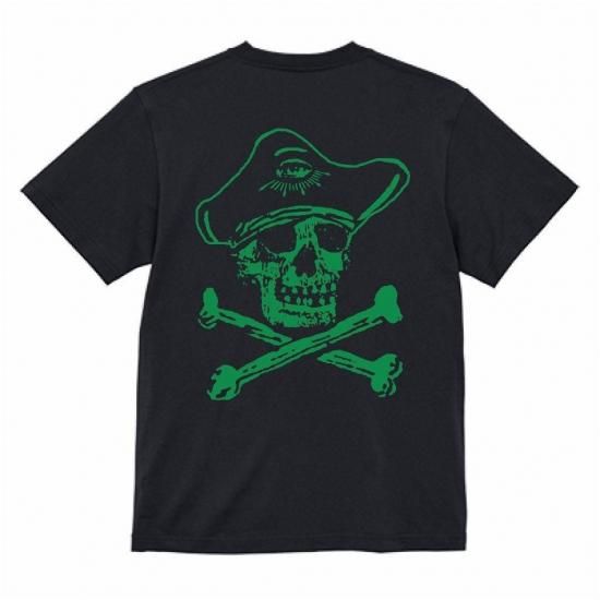 Cotton100%のブラックボディーにグリーンプリント、左胸にハート・イン・ハンド×バックにガツンと1発スカルパイレーツ♪