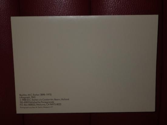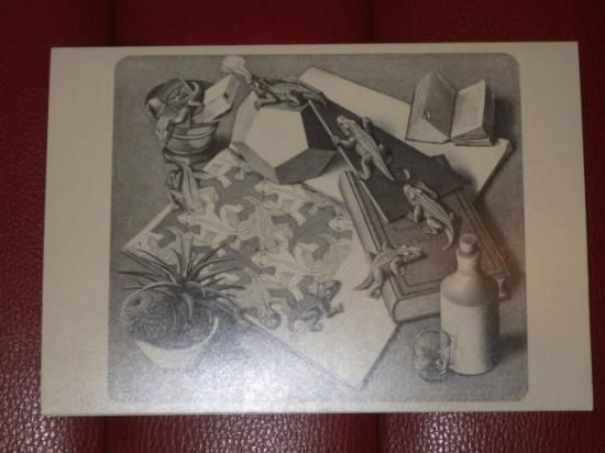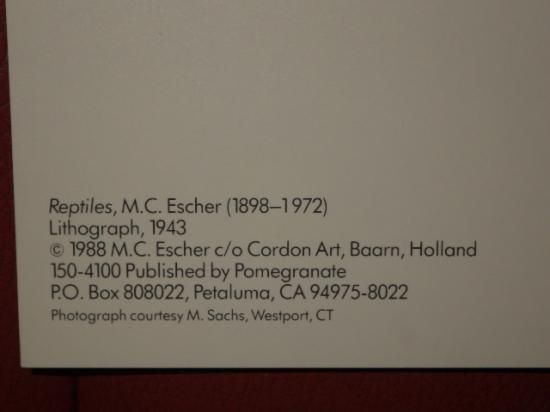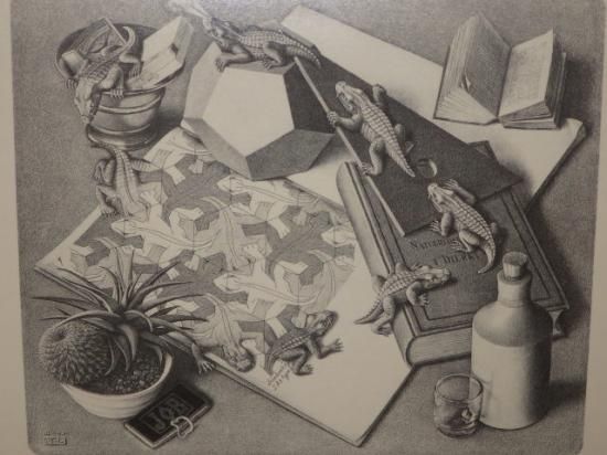 スケッチブックのモザイク画から、実体化した可愛らしいワニが這い出てきて、再び平面に戻っていくという騙し絵、1943年の作品、Reptiles/爬虫類♪