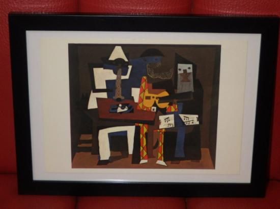 左端のクラリネットを奏でている仮面のピエロは詩人ギヨーム・アポリネール、中央にはギターを弾くアルルカンはピカソ自身、右側で楽譜を手に歌う僧侶は詩人マックス・ジャコブがモデルとされております♪