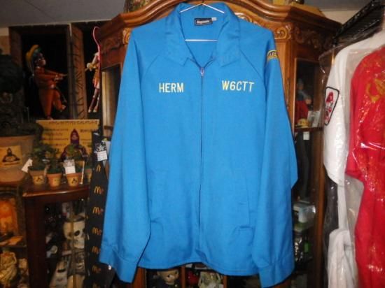 カラーはブルー系に左右の胸にイエロー系カラーでHERM、W6CTTの刺繍、左腕にLOS ANGELES,CALIF.のワッペン、バックはイエロー×ホワイトカラーのプリントで上部にAl malaikaの文字、中央にシュラインのシンボルマーク、その左右に電波塔に電波、その下にAmateur Radio Shrine Clubの文字、たいへんCOOLなデザイン♪